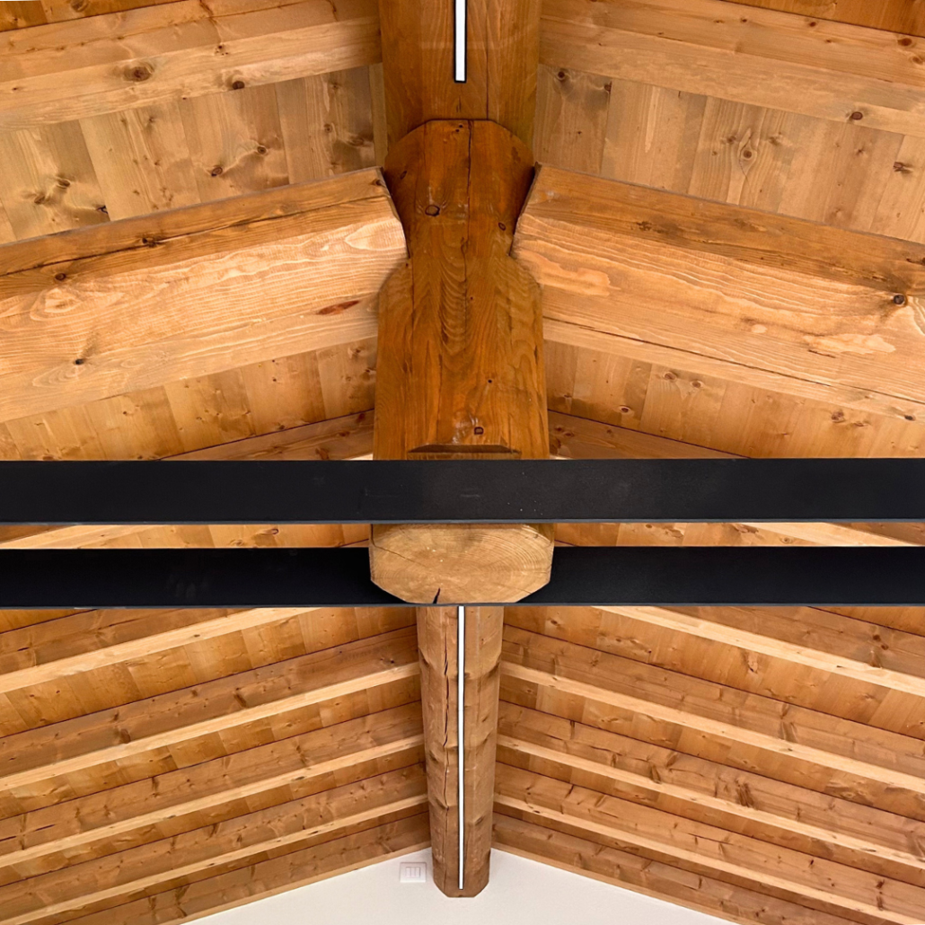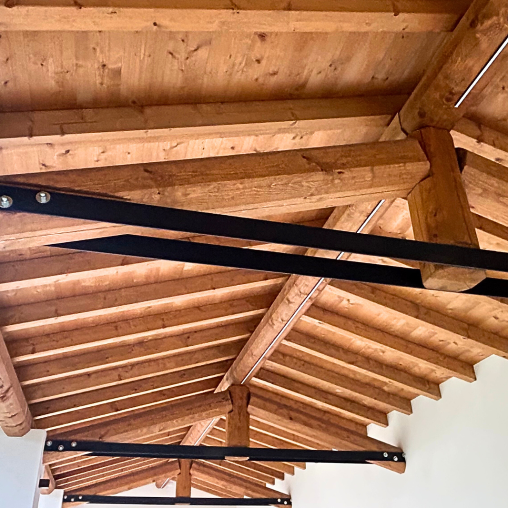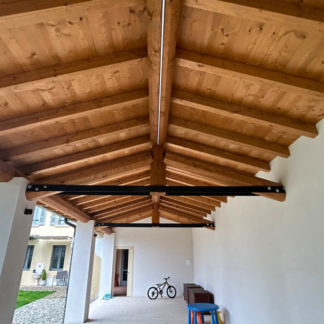 Per questo straordinario progetto abbiamo creato un portico esterno che unisce con maestria tradizione e innovazione. Utilizzando materiali tradizionali come l’UsoFiume in abete per le capriate principali, abbiamo aggiunto calore e solidità alla struttura. Ma non ci siamo fermati qui.