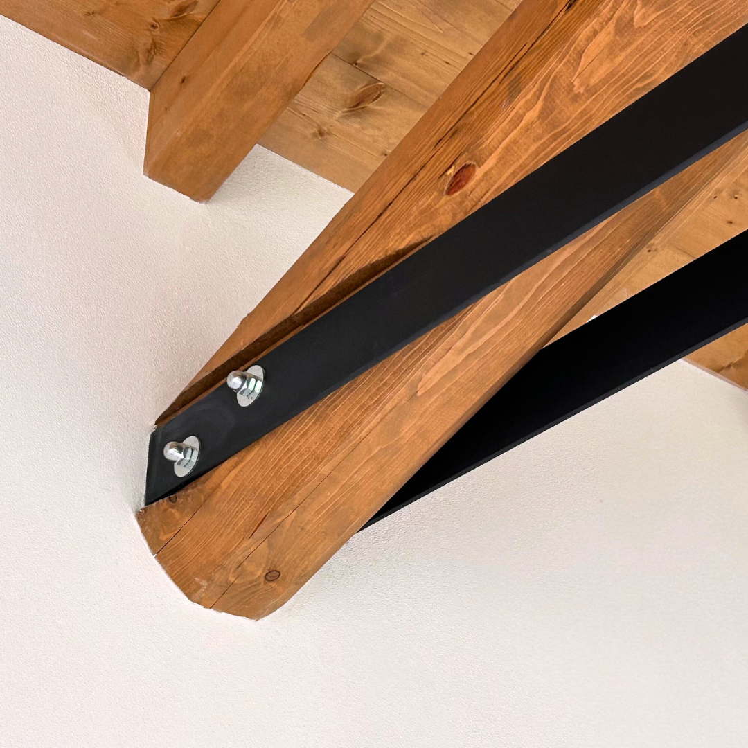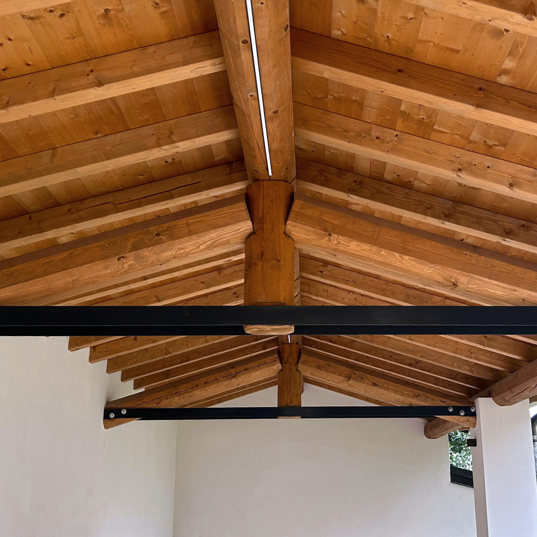 Per questo straordinario progetto abbiamo creato un portico esterno che unisce con maestria tradizione e innovazione. Utilizzando materiali tradizionali come l’UsoFiume in abete per le capriate principali, abbiamo aggiunto calore e solidità alla struttura. Ma non ci siamo fermati qui.
