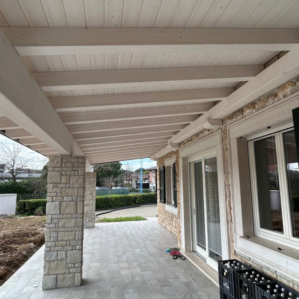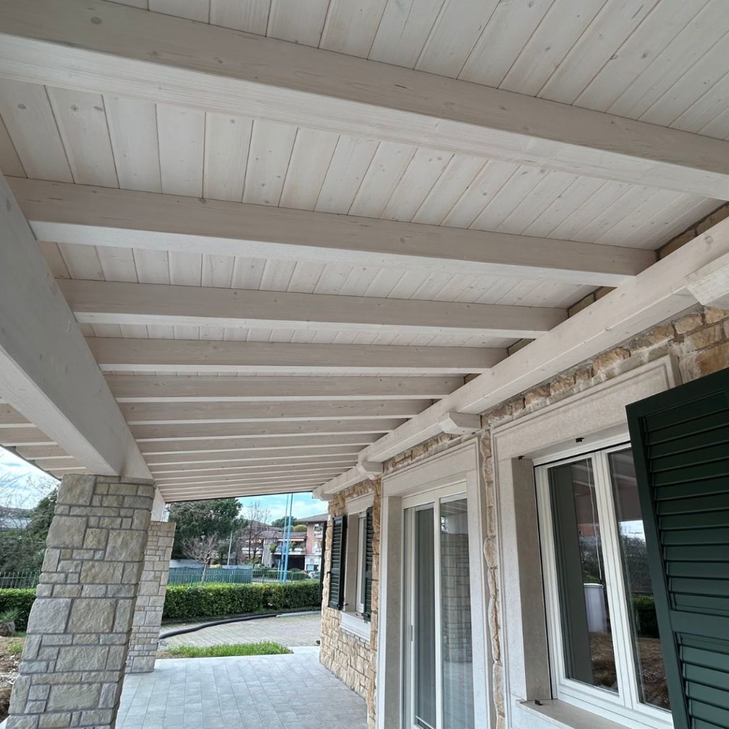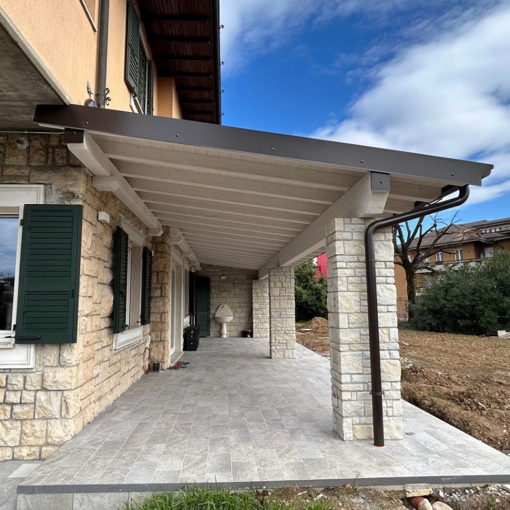 Questo portico rappresenta un perfetto equilibrio tra estetica e funzionalità, esaltando l’architettura e il paesaggio circostante con materiali di alta qualità e uno stile senza tempo.